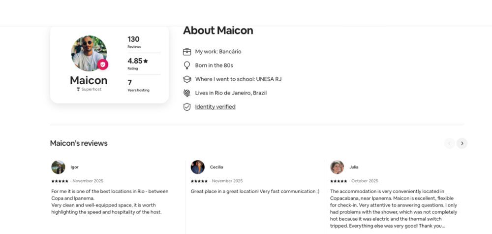 Hello this was a person that Manu Perclat had helped me find when I was looking for an Airbnb to stay at. Cause I had no issue bringing back guys to my hotel. But it became a problem just to have a quick romp and pop back out. With the older staff that was there. Mind you I did pay for two people for the entire trip. So I would not have to deal with questions. However that was not a great experience. So Manu gave me many options of Airbnb's of friends he knew. This place here https://www.airbnb.com/rooms/1290514106478851596?guests=1&adults=1&s=67&unique_share_id=87d19865-003e-477b-9165-6a2e2005587d Maicon was a great host. Helped me when the airlines had lost my luggage. His place was small but had a full fridge a door man and a great location. Two blocks from the beach and in an area that was safe to walk day or night. I honestly hate that I can't stay here again. But the one thing you should do is double check the wifi. So message the host to make sure its good and strong. I think whether you are a novice or veteran of brazil I think a door man is a smart safety measure. If you are not a skinny guy or have mobility issues. These next two things are a must. One make sure you have a bathroom with a " American" sized shower. I had to squeeze my fat ass into the one at the Airbnb which I have linked in this post. This was the only deal breaker for me. Because one it was difficult to have a good hot shower. And some fun with the guys I brought back to shower with. By the way the guys did a great job of making sure my balls were throughly cleaned. Also if you have any mobility issues make sure the Airbnb has an elevator. My two cents.