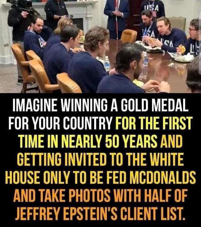 There's nothing funny or lighthearted about the moment we find ourselves in. People aRE losing health care thanks to this man, businessES of 30 years is going under, others have lost their food assistance, Americans are being killed in the streets, everyone's worried that the 2026 midterms, if they happen at all, will be undermined ... Meanwhile, Trump stands there blustering, bullying, and heaping praise on a bunch of hockey players while women who were raped as children by his friend Jeffrey sit only a few feet away, unacknowledged ...